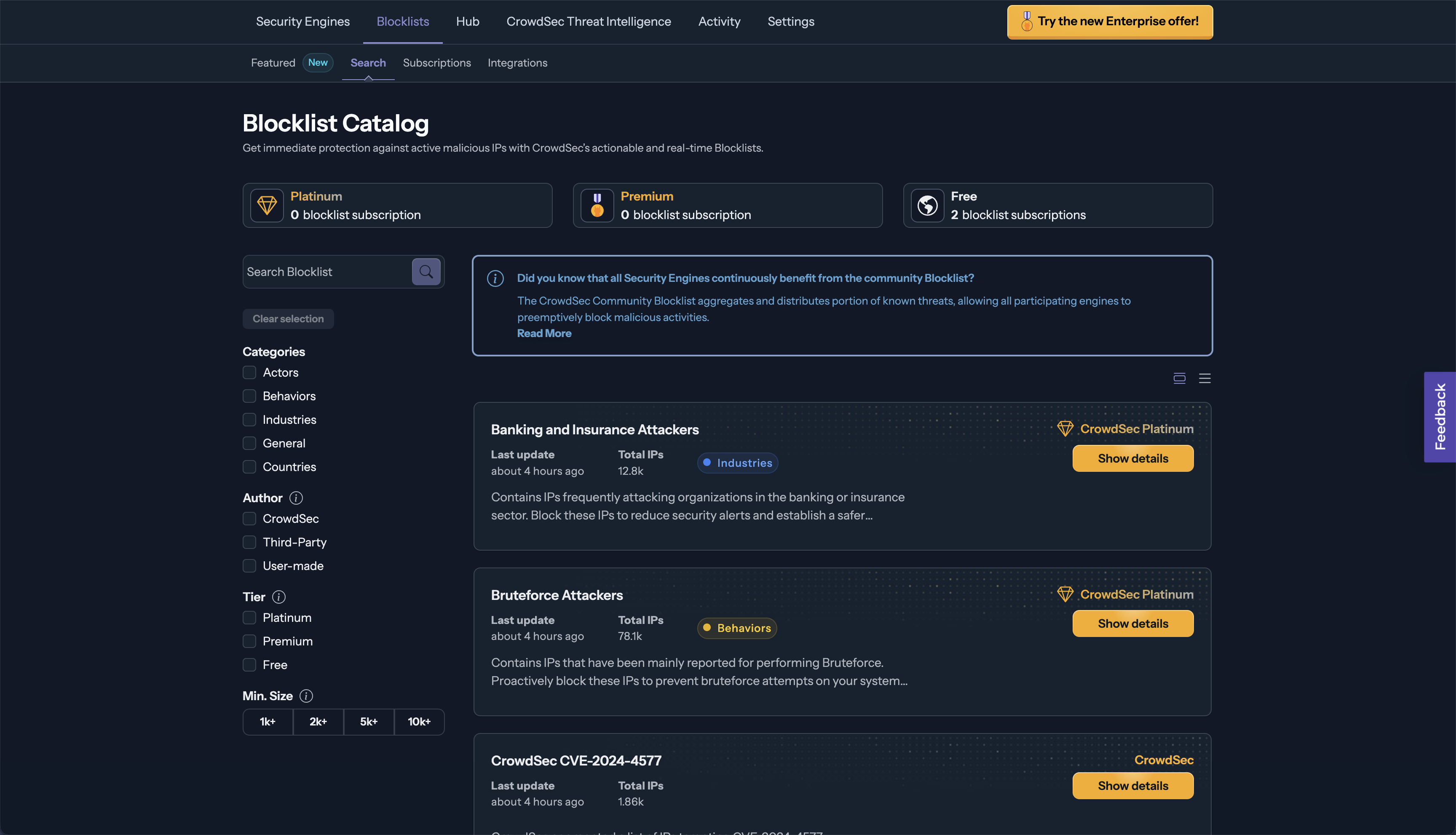 To provide blocklists tailored to each need, CrowdSec has a wide catalog of blocklists, encompassing a variety of threat types and sources. This diversity allows to select and implement blocklists that best match their specific security requirements. The search page in the CrowdSec Console provides a centralized interface to explore, subscribe, and manage blocklists tailored to enhance your organization’s security posture. This page allows to browse all available blocklists, find the ones most relevant to your needs, and activate them to protect your infrastructure.