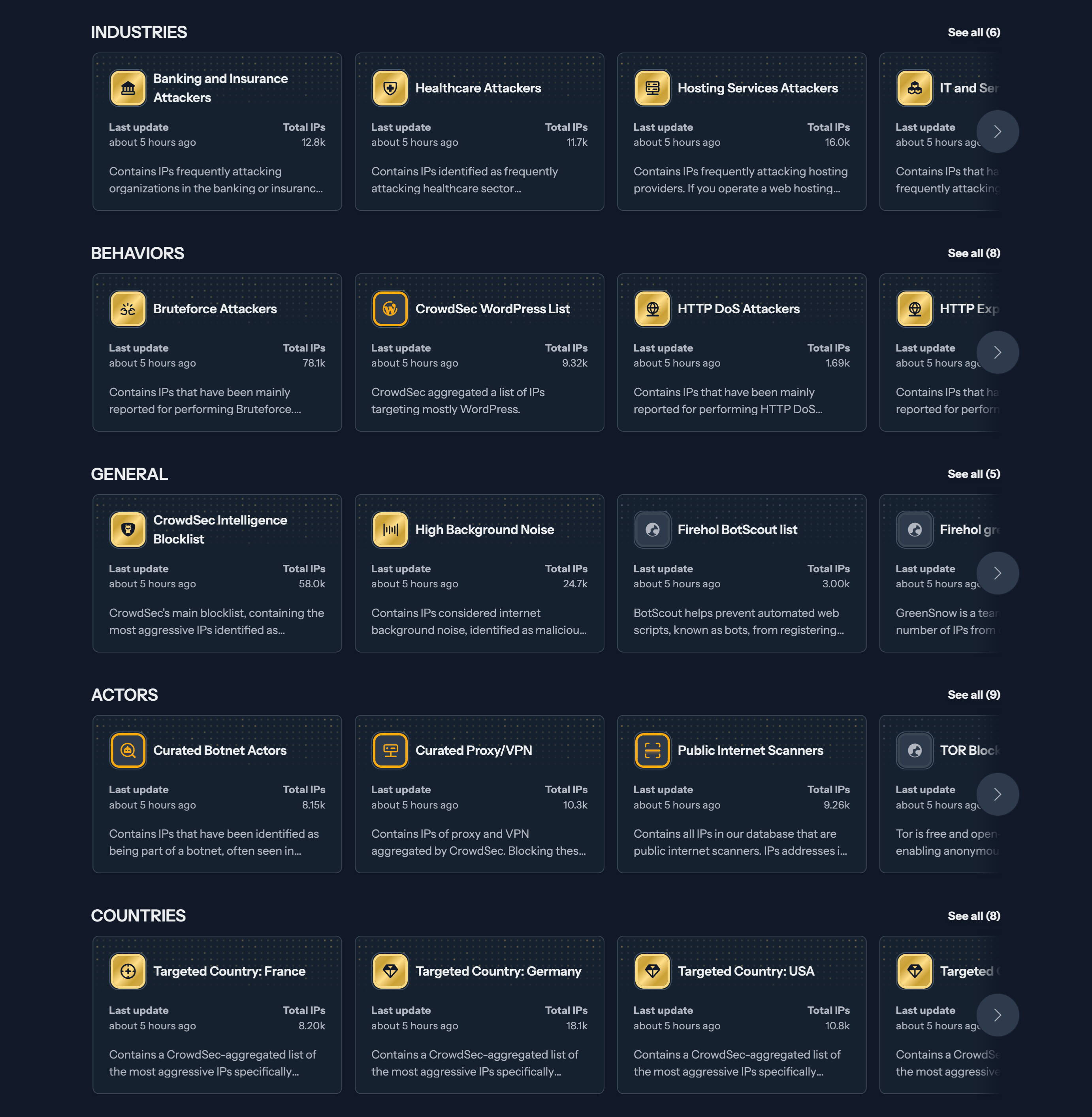 Under the Blocklist suggestions, another section regroups many CrowdSec Blocklists, grouped into main categories addressing different security needs. These Blocklists are categorized to make it quick for users to navigate and identify the most relevant ones based on their infrastructure, industry, or attack patterns. By selecting the appropriate Blocklists, users can enhance their security defenses and proactively mitigate threats.